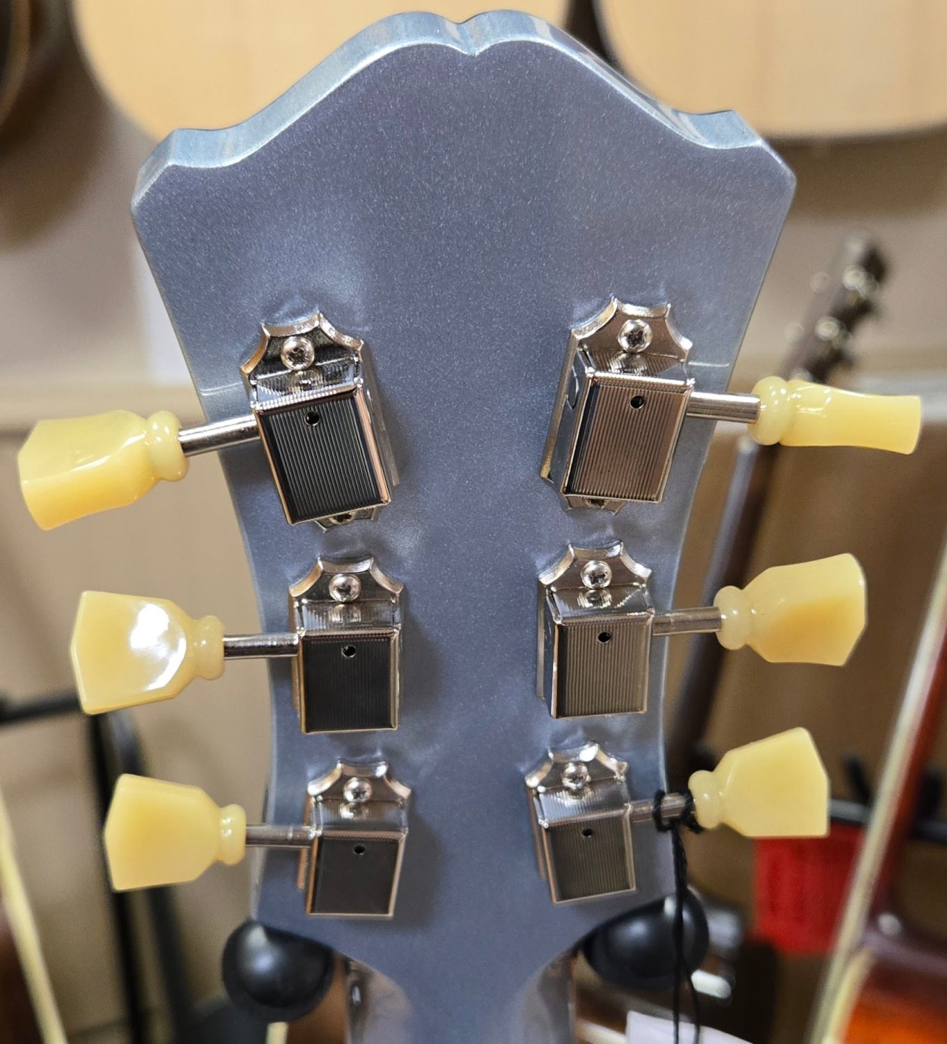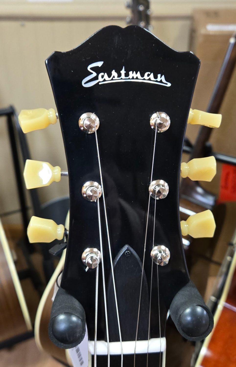 The T64-T-IBM is a new model from Eastman. Metallic blue thinline hollow body featuring Tonerider Dogear P-90'spickups.