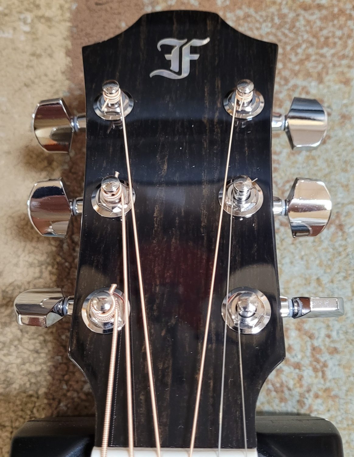 - Refined soft appearance featuring a rosette with a walnut double ring, faux tortoise body binding, and white mother-of-pearl dot fingerboard position markers.